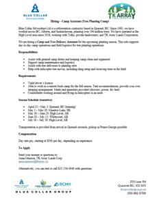 Blue Collar Silviculture Ltd is a reforestation contractor based in Quesnel, BC. Since 1983, we have worked across BC, Alberta, and Saskatchewan, planting over 500 million trees. We have operated in the High Level area since 2018, working with Tolko, private landowners, and TK Array Lands Corporation. We are hiring a Camp and Tree Delivery Assistant for the upcoming planting season. This role supports day-to-day camp operations and field logistics for tree planting operations.
